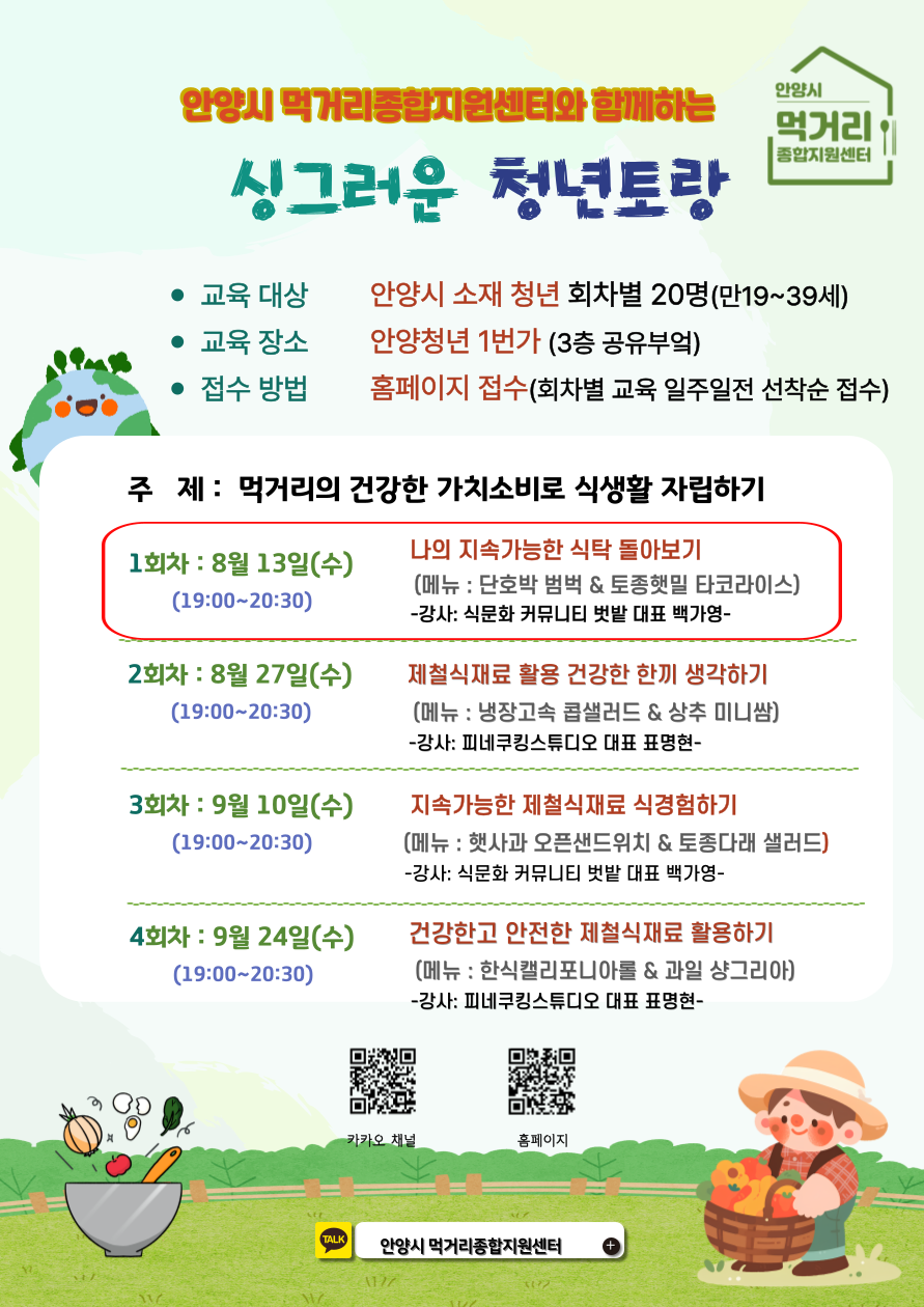 회차별로 먹거리의 건강한 가치소비에 대한 이야기와 식생활 자립을 위한 팁을 알려드리니 많은 참여 부탁드립니다.
